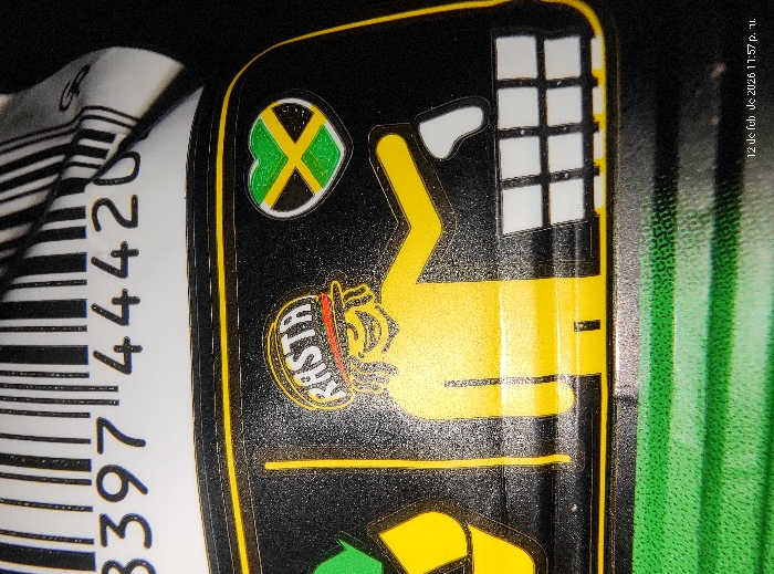 A close-up captures a can's label. The black label features a yellow cartoon figure, possibly "Rasta," with a pot on its head. Above, a green heart with a yellow "X" and a grid of white squares appear. To the left, a partially visible barcode on a white background shows the number "339744420." The can's right side has vertical green stripes. A timestamp indicates "12 de feb de 2026 11:57 p. m."
