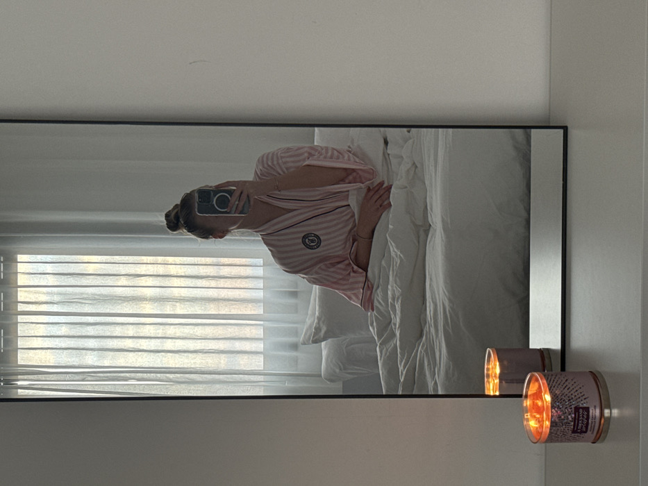 A mirror reflects a scene of domestic comfort. A woman with a bun holds a phone up to take a picture of herself in a pink and white striped robe while lying in bed. Sunlight filters through window blinds in the background. A partially visible lit candle sits on a shelf in the lower right corner, reflecting light and adding a warm ambiance to the scene. The mirror's frame is slim and dark, contrasting with the bright and airy room it reflects.