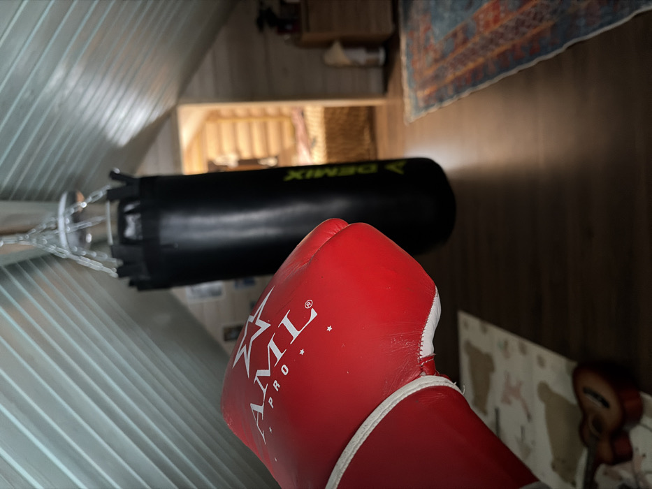 This image depicts an interior scene in Vaskelovo, Russia, set within what appears to be a finished attic or mansard room with a sloped, paneled ceiling. In the immediate foreground on the left, a single red boxing glove with "AML PRO" branding in white text is prominently featured, oriented with the thumb portion facing away from the viewer. Behind the glove, centrally positioned, a black cylindrical punching bag branded "DEMIX" in yellow/green text hangs from the sloped ceiling via a metallic chain suspension system. The floor is dark wood laminate. On the right side, a blue and red patterned oriental-style rug partially covers the floor. On the left, a portion of a lighter-colored rug with brown, possibly animal-shaped, patterns is visible, alongside a small, light-brown string instrument, resembling a ukulele or mandolin, lying on the floor. In the background, a doorway opens into an adjacent room characterized by light-colored log walls. A wooden cabinet or bedside table is visible to the right of this doorway. No individuals are present in the scene. The ambient lighting suggests a subdued interior with brighter light emanating from the room beyond the doorway.