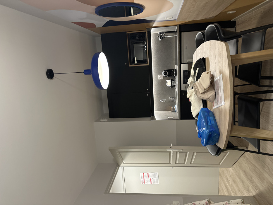 The image depicts the interior of a modern studio apartment or aparthotel room, located in Serris, France. The scene encompasses a combined kitchenette and dining area, illuminated by artificial light. In the foreground, a light wood oval dining table, supported by wooden legs, is positioned centrally. Four black chairs with curved backs are arranged around it. Resting on the table are a blue plastic bag, a light beige handbag, a white garment, a black garment, and a piece of paper. A blue industrial-style pendant light fixture with a black mount hangs directly above the table, emitting bright white light. To the right, a compact kitchenette features black upper and lower cabinetry, a gray tiled backsplash, and under-cabinet strip lighting. The countertop integrates a stainless steel sink with a single-lever faucet and an induction stovetop. A black microwave oven is situated on a wooden shelf above the counter, between the upper and lower cabinets. A black coffee machine, a glass, and other small kitchen items are also present on the countertop. A compact silver 'Candy' brand refrigerator is integrated beneath the counter. The wall adjacent to the kitchenette displays a large, abstract mural with organic shapes in peach, brown, and blue, incorporating a circular blue-framed mirror. To the left, a light beige interior door with two recessed panels and a silver handle stands partially open, revealing a glimpse into an adjacent room, likely a bathroom or entrance. A red and white safety notice is affixed to the inside surface of this door. The room features white upper walls with a medium gray lower section on the left, and light wood-look laminate flooring. No individuals are visible in the scene.
