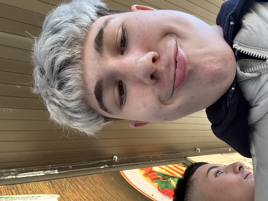The image displays a close-up, low-angle view of two young males, likely taken inside a casual dining establishment in Botevgrad, Bulgaria. The dominant subject, positioned centrally and appearing to be taking a selfie, is a male with bleached, wavy, silver-blonde hair styled in a bowl cut with a short fringe. He looks downwards and slightly to the right, with his lips pursed into a slight smirk or smile, creating visible dimples in his cheeks. He wears a dark hooded garment under a light-colored (possibly white or light grey) puffer jacket with a zippered front. In the lower-left corner, the partial profile of a second male is visible, with short, dark hair styled with a fade. This individual is looking upwards and to the left, away from the camera. The background on the left side features a vertical element, likely a sign or menu, showing a white plate with an orange rim holding a dish containing what appears to be grilled cheese or similar food, garnished with green herbs. The background behind the primary subject consists of light brown horizontal wooden paneling. No direct interaction between the two individuals is evident.