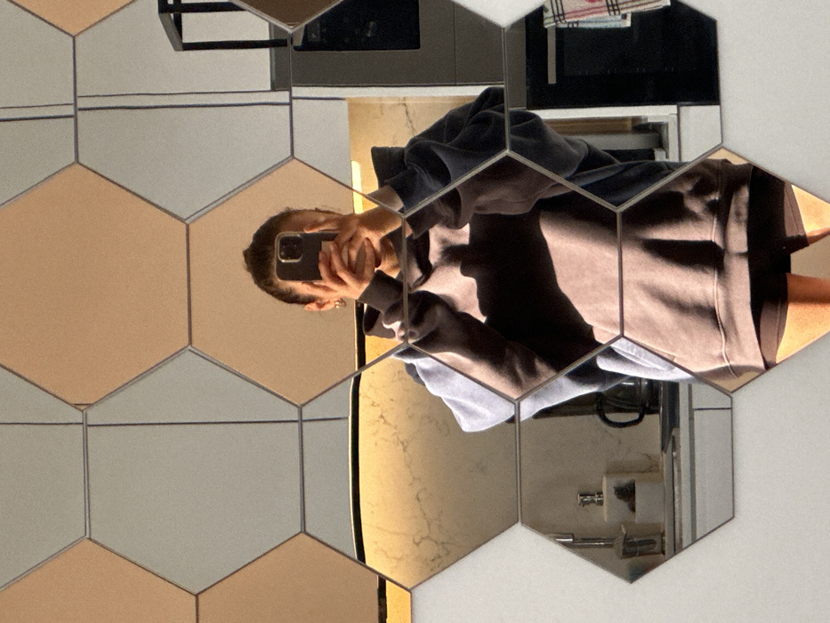 An indoor scene captured through a selfie reflected in a wall adorned with hexagonal mirror tiles in what appears to be a residential interior