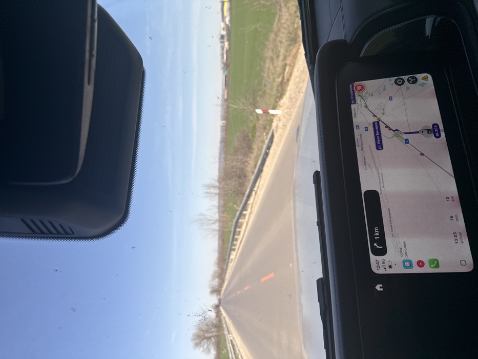The image depicts a driver's perspective from within a vehicle, looking forward through a dirty windshield on a clear, sunny day. The vehicle is traveling on a straight, two-lane asphalt road with distinct red markings painted on its surface. A metal guardrail runs along the right side of the road, accompanied by a red and white striped marker post. The surrounding environment is rural, characterized by bare deciduous trees and shrubs lining the road and a field of green crops extending into the middle distance on the right. Industrial or commercial buildings are visible on the far horizon to the right. The lower portion of the image displays the vehicle's dashboard, including the windshield wipers and a digital navigation screen. The screen shows a map application indicating a route to Pleven, Bulgaria. The current time is 12:47. The navigation system displays the next turn in 1 kilometer, an estimated arrival time of 13:03, a remaining travel time of 16 minutes, and a distance of 13 kilometers to the destination. Key locations visible on the map include "Плевен" (Pleven), "Долна Митрополия" (Dolna Mitropoliya), "Ясен" (Yasen), and "ул. Иван Винаров" (Ivan Vinarov Street) within Pleven, along with the road designation "Р-305". Based on the navigation, the vehicle is located on a rural road segment approaching the city of Pleven, Bulgaria, specifically traveling between the settlements of Dolna Mitropoliya and Yasen, heading towards Pleven.