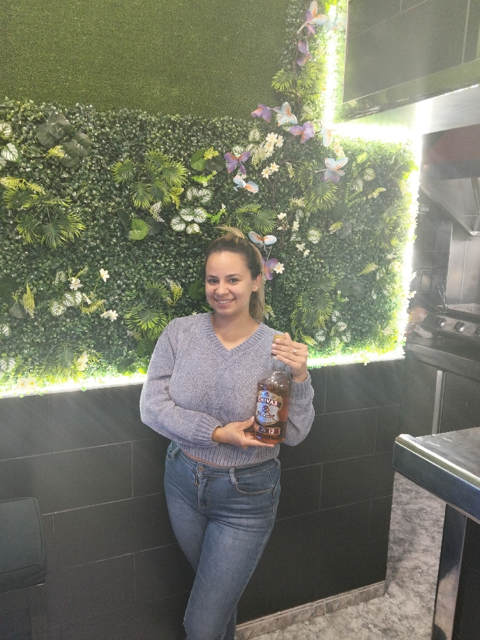 A woman smiles, holding a bottle of Chivas Regal 12. She wears a blue cropped sweater and jeans. Behind her, a wall covered in greenery, white flowers, and purple butterflies is illuminated by a bright, crossed light. To the right is a stainless steel kitchen setup with a stove. The scene is indoors with dark tile walls and flooring.