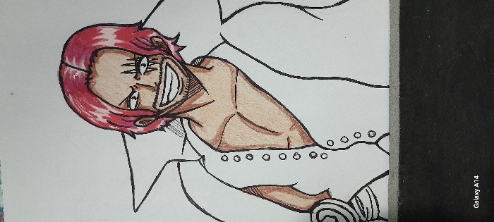 This image displays a hand-drawn illustration of an anime-style male character, known as Shanks from *One Piece*, rendered against a plain white background