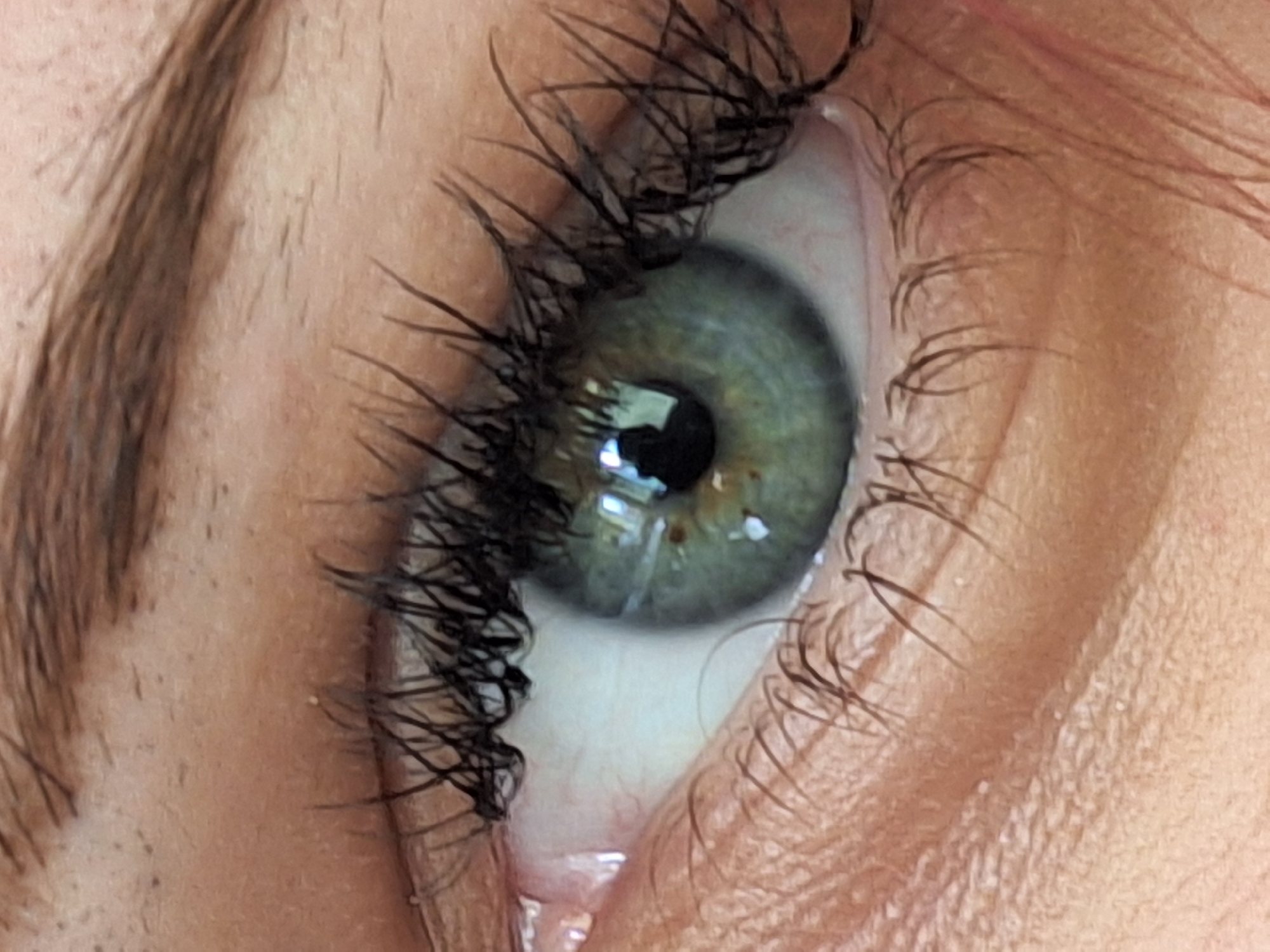 The scene is situated in Kozloduy, Bulgaria. This image presents a close-up, forensic view of a human right eye. The iris is primarily green-grey with distinct irregular brown flecks and radial striations. The pupil is dark, round, and dilated, containing a clear reflection of a dark, vertically oriented object set against a lighter, vertically segmented background, suggesting an interior or exterior light source with structural elements. The visible sclera is white, with fine red capillaries noticeable in the medial canthus. The upper eyelid displays numerous long, dark eyelashes, appearing to be coated. Shorter, less dense eyelashes are present along the lower lid. The surrounding skin is light-toned, showing pores, fine lines, and the lower edge of a light brown eyebrow. A small amount of moisture is visible in the lower eyelid waterline and medial canthus.