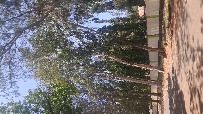 The scene depicts an outdoor environment in Waa Ngombeni ward, Kenya, under a clear blue sky. Multiple tall trees with varying foliage density and trunk colors, including light grey-white and dark brown, occupy the upper two-thirds of the image. Shadows from these trees are cast onto a dark grey paved surface in the foreground, which borders an area of reddish-brown earth. This earthen area contains sparse dry vegetation and scattered wood debris. A white wall, featuring a distinct horizontal green stripe along its upper section, runs across the midground, functioning as a boundary. A dark pole or street lamp is partially visible on the far left behind the trees. A faint red object or structure is discernible in the distant background, partially obscured by foliage. No individuals are present in the frame. The environmental conditions indicate a sunny day.