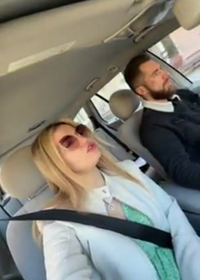 Inside the light-grey interior of a car, a blonde woman wearing pink sunglasses, a white jacket, and a green dress occupies the passenger seat. She appears to be singing along to music, her lips moving with the lyrics. Beside her, in the driver's seat, a man with a beard is focused on the road. He's wearing a dark jacket over a white turtleneck. The car is in motion, as suggested by the changing scenery visible through the windows.
