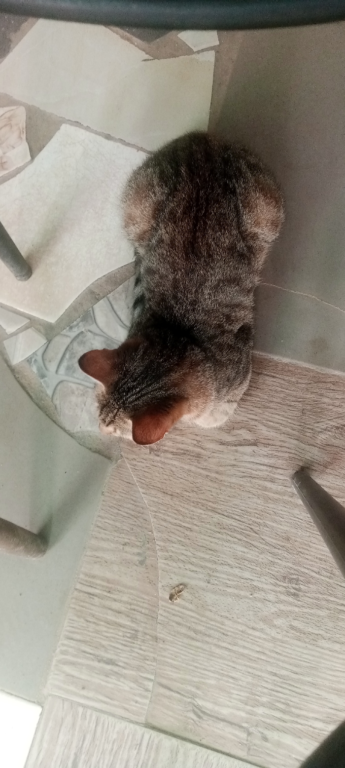 The image displays an indoor floor scene in Madalla, Nigeria. A domestic tabby cat, exhibiting brown and grey fur patterns, is centrally positioned on a light wood-grain patterned floor. The cat's back faces the viewer, and its head is slightly turned to its left, directing its gaze downward towards a small, light-colored insect, possibly a deceased fly, located directly in front of its face on the wood-grain surface. To the left and upper left, the floor transitions into an area of grey-toned mosaic tiling composed of irregularly shaped light-colored pieces. A silver cylindrical furniture leg rests on the mosaic tiling in the upper left, while a dark, tapered furniture leg is visible on the wood-grain floor in the lower right. A dark, horizontal bar or surface occupies the top edge of the frame. No human subjects are present.