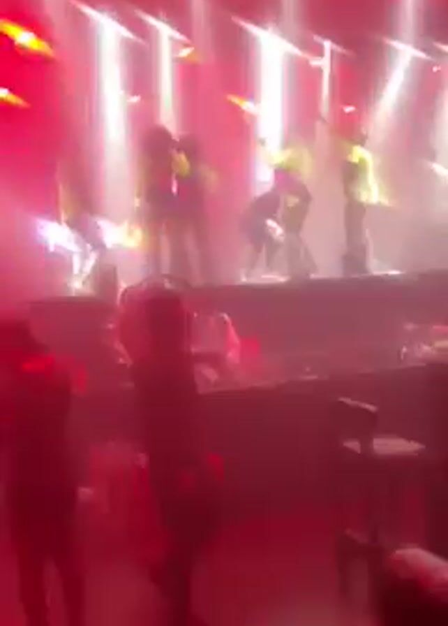 The video depicts a concert venue or nightclub. Five people are performing on a stage. They are wearing brightly colored clothing and are lit by spotlights. There is a visible crowd in the foreground, with some people moving around. The venue appears to be dark with a smoky atmosphere.