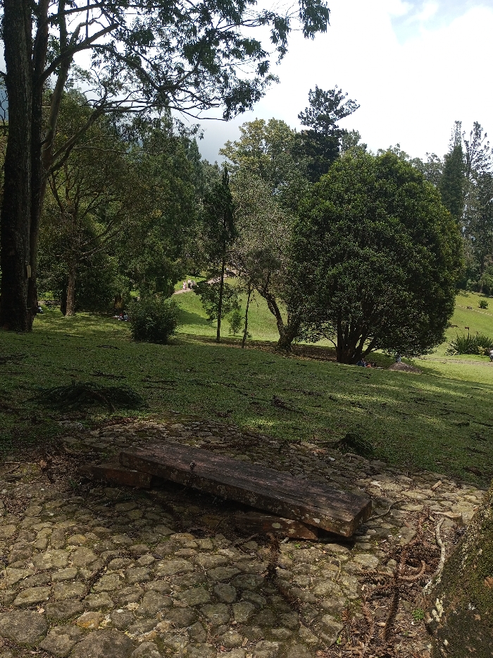 A stone paved area foregrounds a verdant scene, featuring a weathered wooden bench. An expansive grassy field stretches uphill, dotted with various trees and shrubs, creating a park-like environment. Individuals are subtly visible in the distance, relaxing beneath the trees. Overhanging branches from tall trees frame the top of the image, adding depth and shadow to the composition.