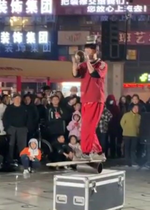 In a nighttime outdoor scene, a man in a red sweatsuit performs a balancing act for a crowd on a well-lit city street. He stands atop a plank which rests on a cylinder, all of which is set upon a black metal box with wheels. Atop his head are a few metal pots or cans that he is balancing. The performer briefly squats while keeping his balance. There is a crowd of men, women, and children watching the performance. In the background are businesses with signs in a language that appears to be Chinese.