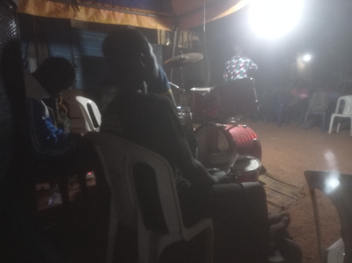 A dimly lit scene features a group of individuals, one positioned behind a drum set with a colorful shirt. Several people are seated in white plastic chairs in the foreground, including one person in the center with their arm raised. The background includes more chairs and indistinct figures. The lighting is poor, creating shadows and obscuring details. The scene suggests a gathering or performance taking place.