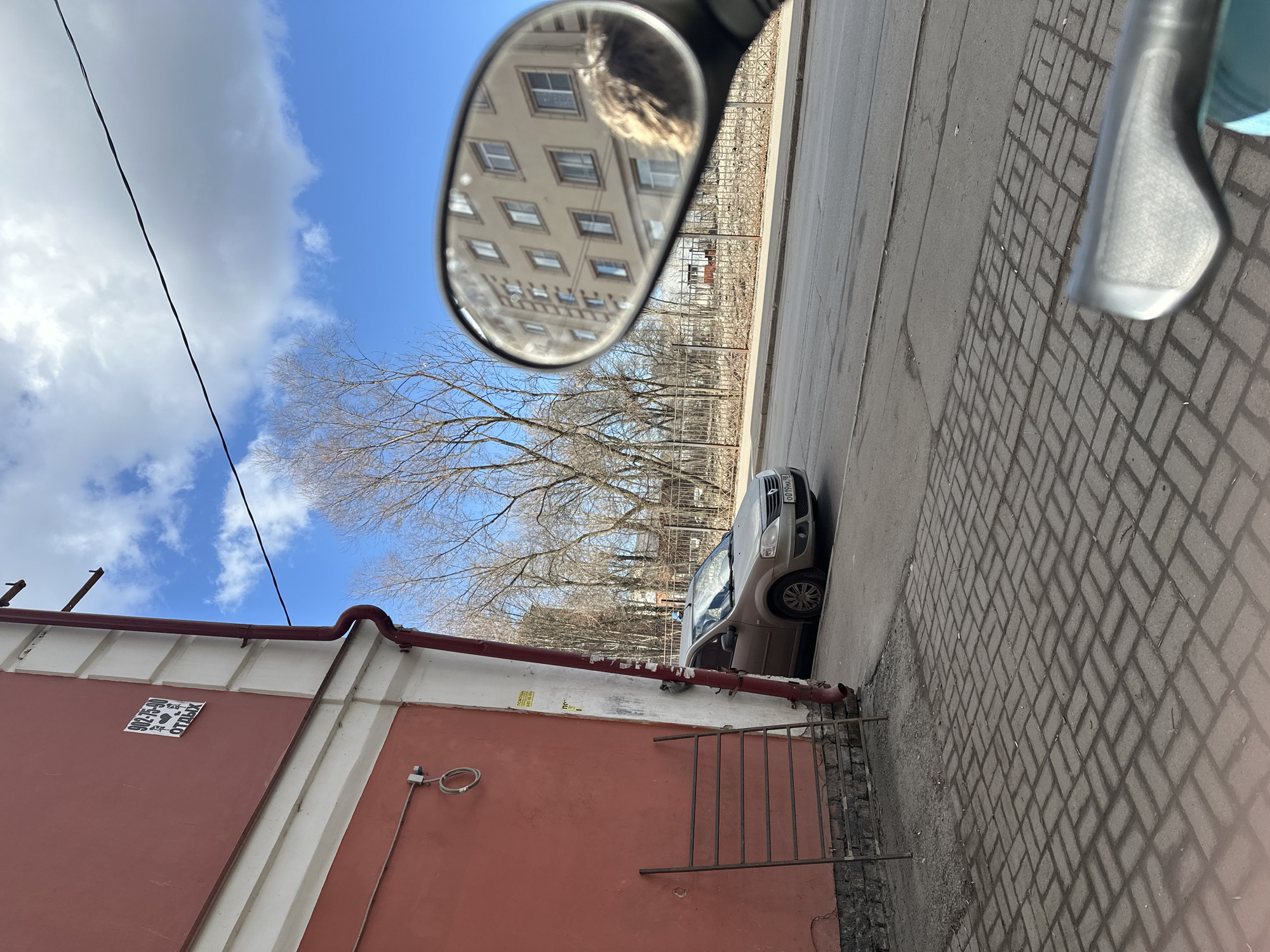 This image depicts an urban scene on a partially cloudy day, likely late winter or early spring, in Saint Petersburg, Russia. The specific location is Ligovsky Prospekt 113. In the immediate foreground, the lower section of a vehicle's handlebar, possibly a motorcycle or scooter, is visible. An oval side mirror attached to this vehicle reflects a multi-story, light beige building with numerous windows, and the upper portion of a person's light brown, wavy hair. The ground beneath the vehicle is a grey paved sidewalk composed of rectangular bricks laid in a herringbone pattern, showing some discoloration. To the left, a two-story building with a red-orange facade and white architectural trim extends vertically out of frame. A dark red downspout runs along the corner of this building. Affixed to the red wall are two signs: a white rectangular sign near the top displaying "902-75-90" and the Cyrillic word "ОТДЫХ" (OTDYKH), and a smaller, faded yellow sign below the white trim with "941-05-00" and "ПОМОЩЬ" (POMOSHCH). Leaning against the red building, near its base, is a dark, rudimentary metal rack with horizontal bars. The building's foundation consists of dark, roughly textured blocks. In the midground, a light brown Renault Logan sedan (license plate О019МА 98, indicating the Saint Petersburg region) is parked on the edge of the street, partially on the sidewalk, adjacent to the red building. Beyond the parked car is a paved asphalt road with visible lane markings, suggesting a two-lane thoroughfare. Across the road, a low metal fence encloses a plot of bare ground and numerous deciduous trees with visible branches, indicating they are not in leaf. The background features a clear blue sky interspersed with scattered white and grey clouds. A dark utility wire traverses the upper portion of the frame against the sky. No other individuals are present in the visible scene apart from the reflected person in the mirror.