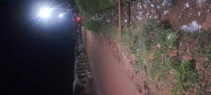 A dimly lit road curves into the darkness, illuminated by a bright streetlight. On one side of the road, a building's skeletal frame is visible. The other side features a dirt embankment with scattered foliage. The road itself has a reddish hue, suggesting the color of the soil. A red light is visible in the distance at the bend. The image is oriented vertically.