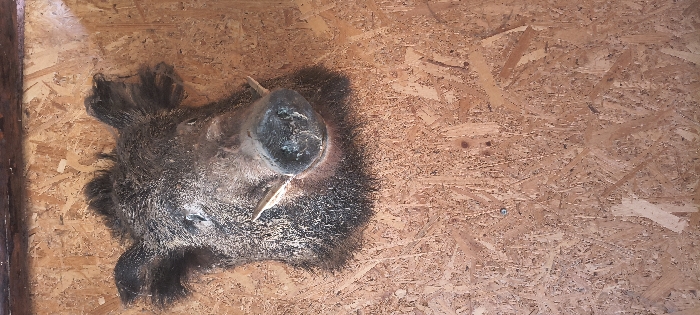 - "A taxidermied wild boar head is mounted on an oriented strand board (OSB) wall in Sredets, Bulgaria" by FM-NFgjz2, licensed under CC BY 4.0