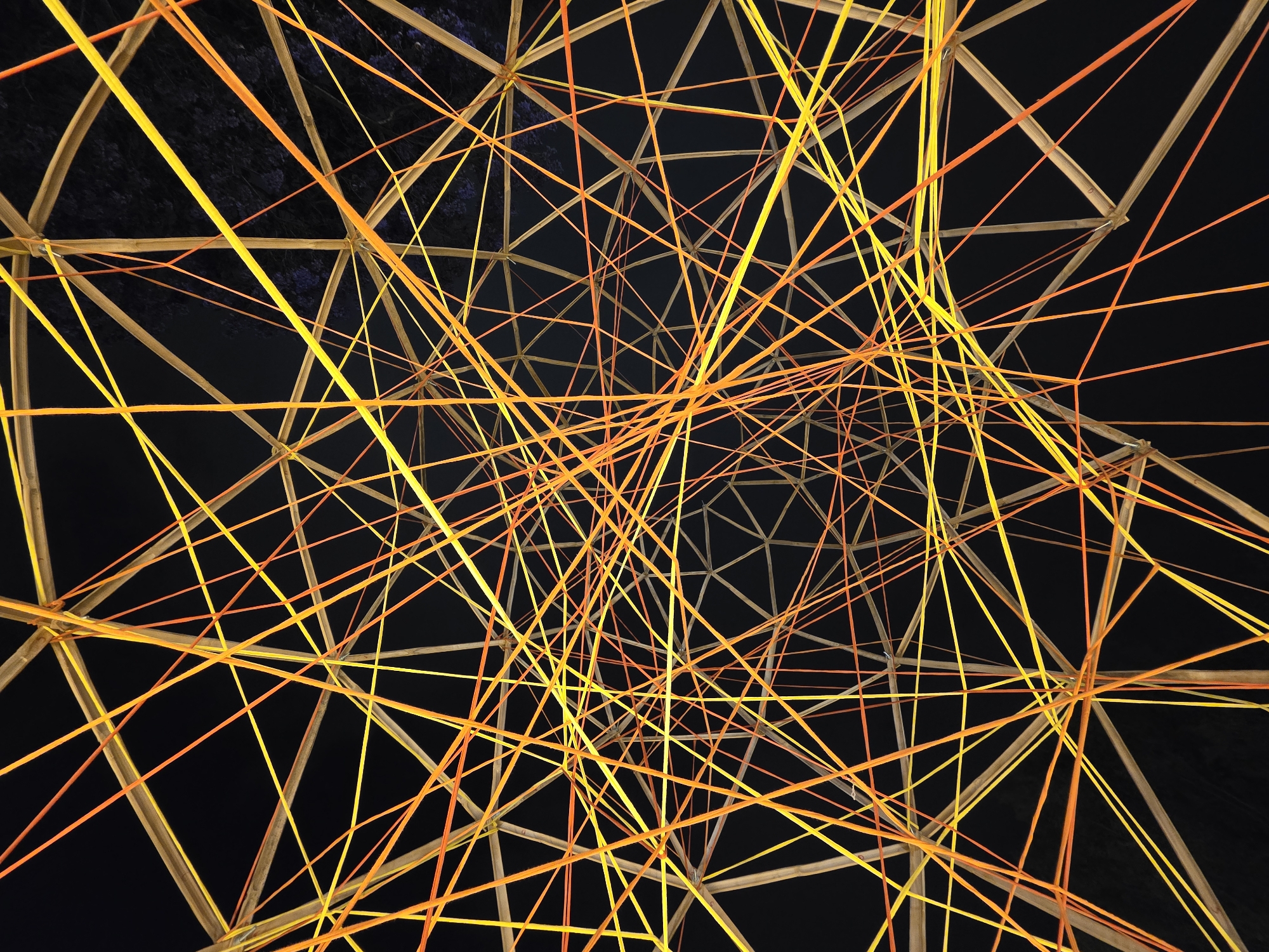 This image depicts a brightly illuminated art installation at night in San Andrés Cholula, Mexico. The central subject is a large, intricate geometric structure, likely a geodesic dome, composed of numerous light-colored, thin struts, possibly bamboo or wood, forming a complex polygonal framework. This framework is densely interwoven with a multitude of taut, glowing lines in vibrant yellow and orange, crisscrossing at various angles to create a dynamic, radiant web. The lines appear to be illuminated cords or strips that emit light. The background is predominantly a deep, dark black, indicating nighttime, with faint, dark silhouettes of tree foliage visible in the upper sections against the dark sky. There are no individuals, specific actions, or interactions present in the scene.