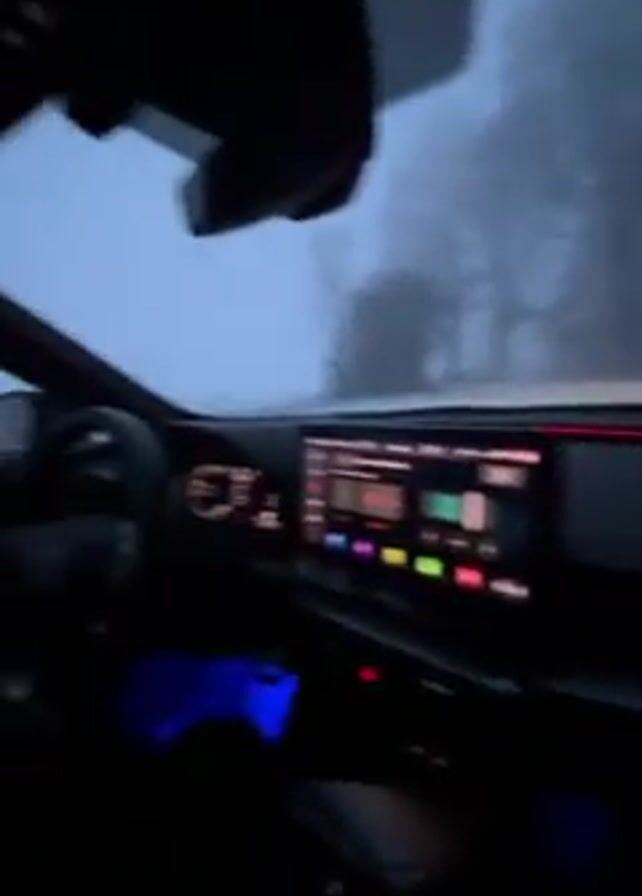 interior of a car driving on a foggy road. The dashboard is visible, with a large touchscreen display illuminated with various colorful icons. A red light strip runs along the dashboard. Blue lights illuminate the footwell area. The driver is briefly visible, holding up a phone, before the view returns to the road ahead. The foggy conditions obscure the trees lining the road. The overall lighting is dim due to the fog and time of day.