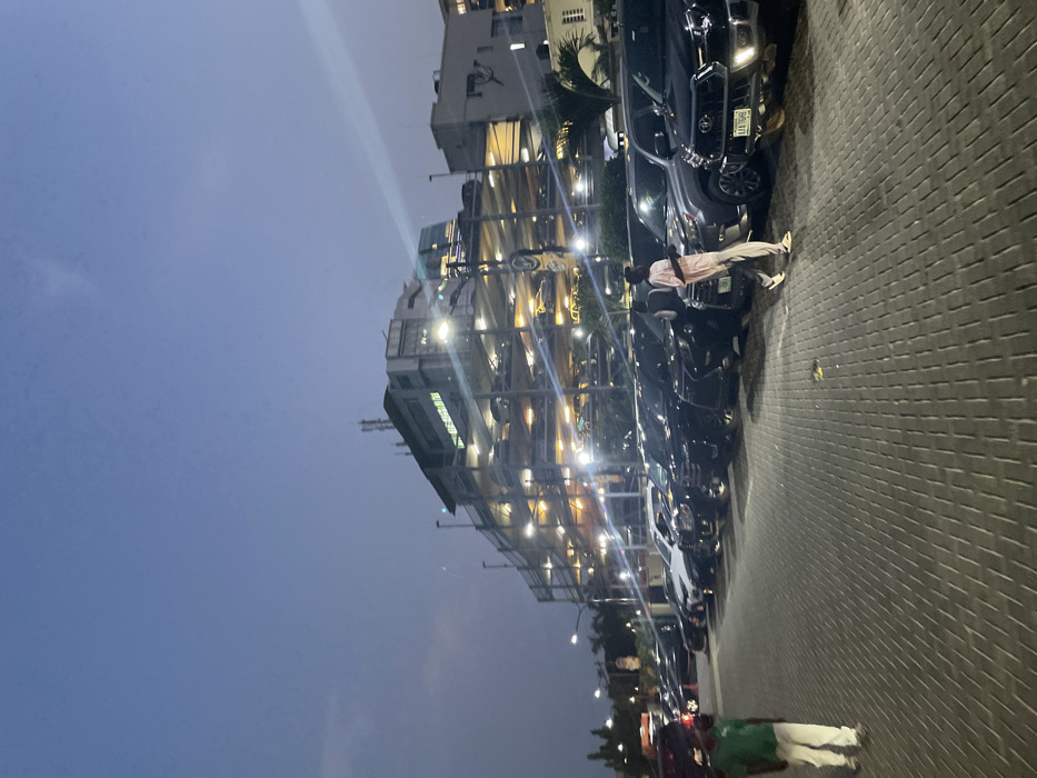 A multi-story building is illuminated with many lights. Several cars are parked along a brick road next to the building. A person wearing light-colored pants and a pink shirt leans into one of the cars. The sky above is a dark gradient blue. Another person in a green and white outfit walks on the bottom of the road.