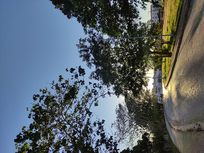 A low-angle perspective reveals a street curving to the right, bordered by a grassy area. Trees with dense foliage frame the scene against a clear blue sky. Sunlight filters through the trees, casting shadows on the asphalt road. Buildings are visible in the distance where the street curves. The image is rotated, making the sky appear on the left.