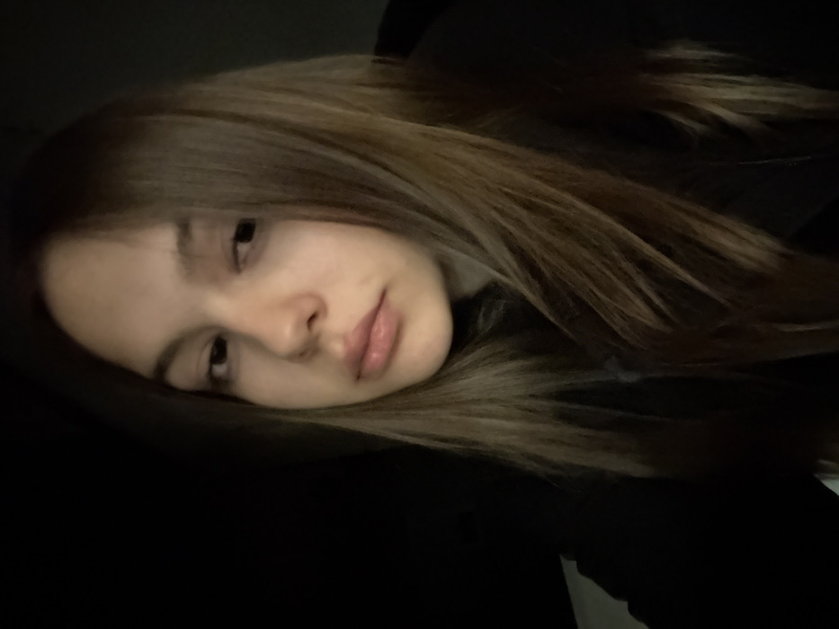 A close-up, dimly lit portrait features a young female subject. She possesses long, straight, light brown hair with subtle highlights, parted on the viewer's left. Her skin complexion is fair. Her eyes are directed slightly downward and to the viewer's right. Her lips are full and slightly parted, showing a natural pink hue. She is wearing a dark-colored garment, possibly a hoodie or jacket, which is partially visible around her neck and shoulders. The background is uniformly dark and indistinct, suggesting low ambient light or a plain dark surface. The primary light source illuminates her face and hair from the front-left. The scene is located in the city of Stara Zagora, Bulgaria.