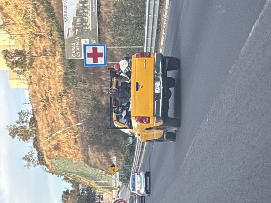 - "A yellow pickup truck is on the road, filled with people in the back" by FM-5mNCn2, licensed under CC BY 4.0