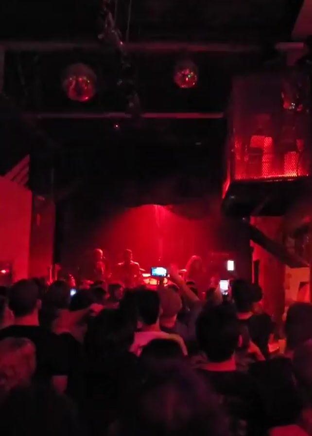 The video captures a live music performance at a venue bathed in red and blue lighting