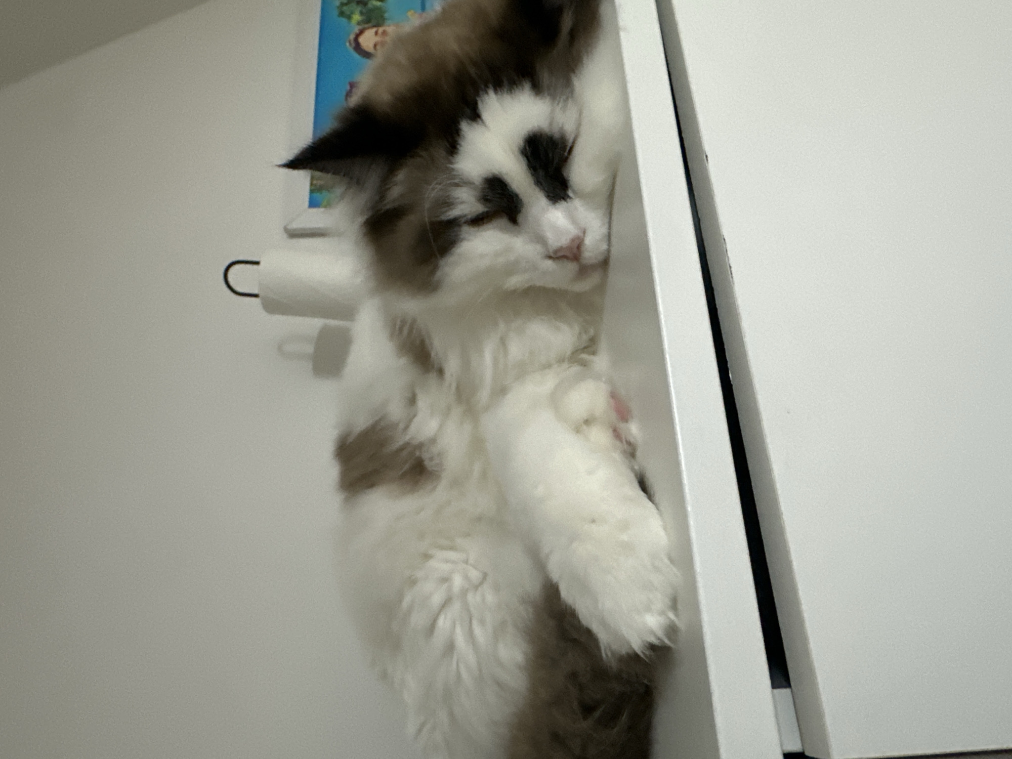 A long-haired domestic cat, exhibiting white, brown, and dark brown/black fur patterns, is depicted sleeping on a white, flat furniture surface. The cat's head, featuring a pink nose and prominent dark markings around the eyes, rests on its front paws. Its body displays white fur with distinct brown patches, and one visible white front paw shows pink paw pads. The furniture beneath the cat is a white unit, with the upper edge of a white drawer or cabinet panel visible below the surface. In the background, on the same furniture surface, a white object with a dark U-shaped handle is present, alongside a partially obscured framed image featuring a human face against a blue background. The surrounding walls are light-toned. The specific location within Hamburg, Germany, cannot be determined from the visual evidence.