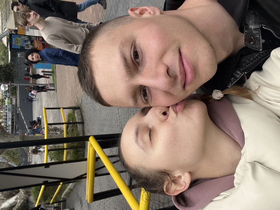 A close-up selfie captures two young adults in the Parque de Atracciones de Madrid, located within Casa de Campo, Madrid, Spain. In the foreground, a female with fair skin and dark hair tied back is depicted on the left. She is wearing a light-colored padded jacket over a light purple hoodie. Her right eye is closed, and her lips are pursed in a kissing gesture directed towards the left cheek of the male subject. The male, positioned on the right, has fair skin, short brown hair, and is wearing a dark jacket. He is looking directly at the camera with a slight smile. The background reveals a public outdoor area with paved ground, characterized by yellow and black metal railings that delineate pathways. Numerous individuals are scattered throughout the mid-ground and distant background, engaged in various activities such as walking. Notable figures include a woman with dark, curly hair wearing a blue jacket, who is looking towards the left, and a young man in a beige sweater walking towards the right, followed by an older man in a dark coat. Sparse trees and multi-level structures with stairs are visible, consistent with an amusement park setting. Red queueing stanchions are present on the right side of the background. The scene is illuminated by natural daylight.
