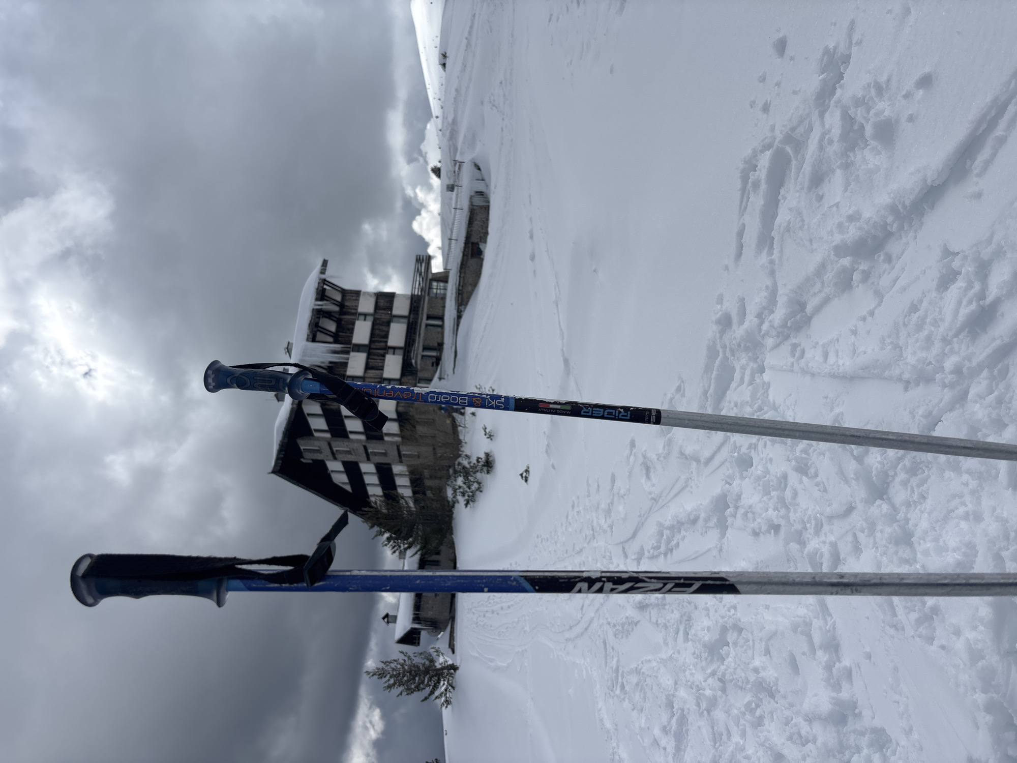 The image captures a snowy scene in an unidentified location in Bulgaria. Two ski poles dominate the foreground, their handles and straps clearly visible. The pole closer to the viewer is black and blue, while the other is silver. Behind the poles, a snow-covered landscape stretches out, showing the footprints of skiers. A building with a weathered facade sits in the midground. The sky is overcast with heavy, grey clouds. The overall impression is of a cold, winter day in a mountain region.