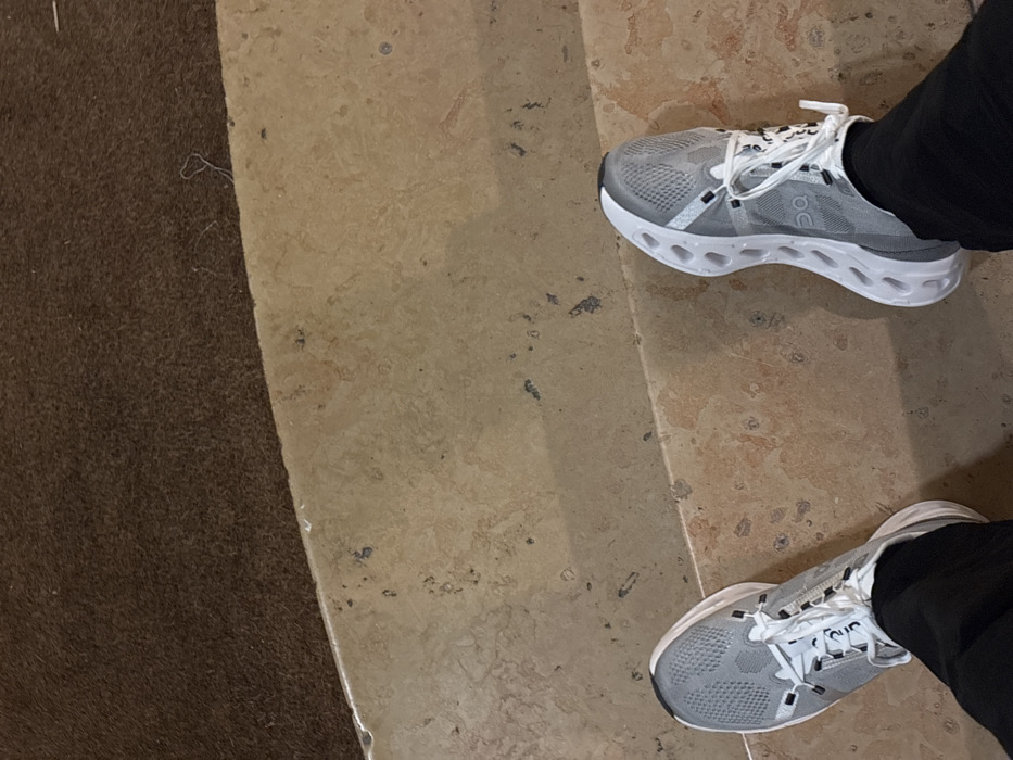A top-down view shows a pair of light gray and white sneakers with visible white laces and black pants. They are placed on a stone floor, which has a pattern of light beige with darker beige and brown spots, next to a brown carpet. The sneakers appear to be of the brand "ON", based on the logo visible on one of the shoes.