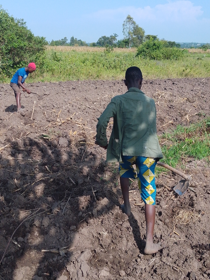 Two figures labor in a tilled field under a bright sky. One, wearing a red cap and blue shirt, digs into the dark soil. The other, seen from the back, wears a green jacket and patterned blue shorts, and carries a hoe. The field stretches into the distance, bordered by patches of green foliage. The foreground soil is dark, revealing remnants of prior crop stalks.