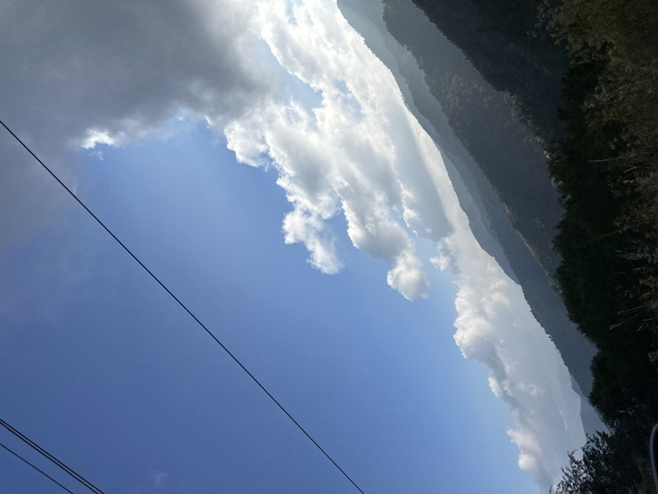 A daytime landscape features a gradient blue sky with billowing white and gray clouds. Power lines diagonally cross the frame. A mountain range, densely covered in trees, forms the backdrop. The mountains are slightly obscured by a light haze, creating depth. The sun is shining, illuminating the clouds and highlighting the variations in the mountain's foliage.