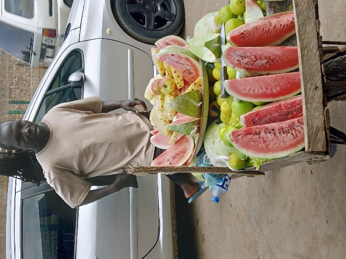 An outdoor scene in Masvingo, Zimbabwe, depicts a male fruit vendor standing behind a wooden pushcart