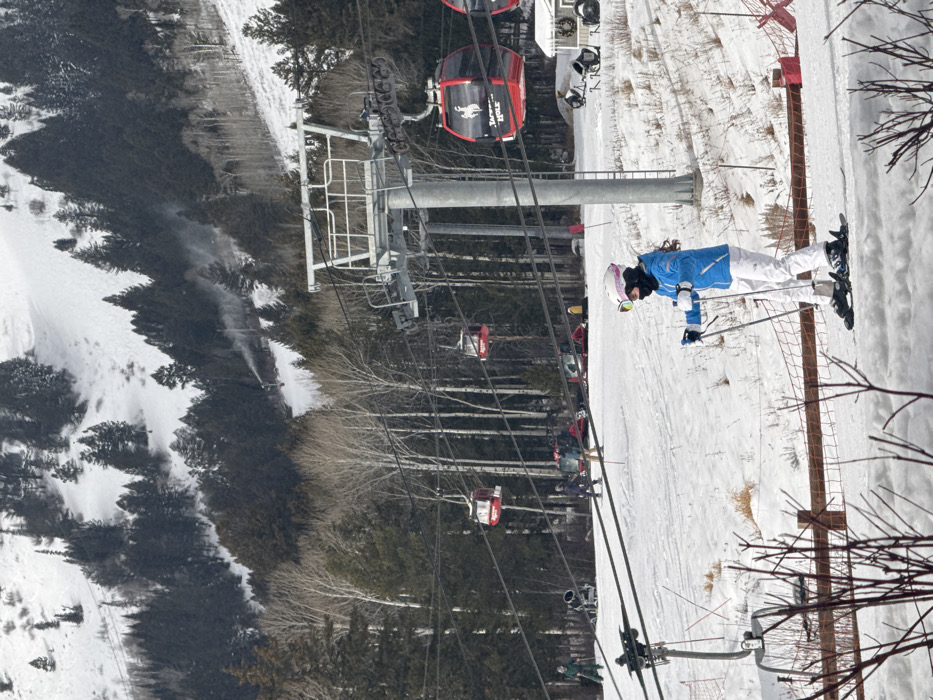 A rotated image shows a ski resort landscape. A gondola lift ascends against a backdrop of snowy mountains and forested terrain. In the foreground, a skier in a blue jacket and white pants stands on the snow-covered slope, holding ski poles. Ski lift towers and cables intersect the scene. The image captures the wintery atmosphere of the resort.