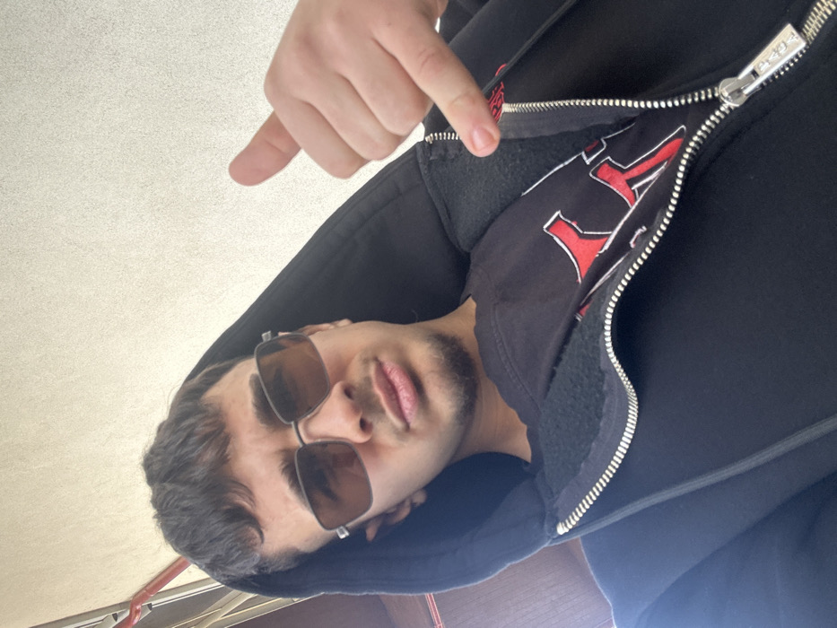 The image displays a close-up, upward-angled portrait of a single male individual. The specific location within Panagyurishte, Bulgaria, is not discernible from the visual information presented. The subject is a young male, appearing to be in his late teens or early twenties, with short, dark hair and light skin. He has a small amount of dark facial hair on his chin. He is wearing rectangular-framed sunglasses with dark lenses. His attire includes a black hooded sweatshirt, partially unzipped to reveal a black t-shirt underneath. The sweatshirt features a silver-colored zipper with a metallic pull tab. The t-shirt displays a red and white graphic design, partially visible beneath the open hoodie. The individual's right hand is raised, positioned to the right side of his head from the viewer's perspective, performing a gesture where the thumb and pinky finger are extended, and the middle three fingers are folded. The background consists of a plain, light-colored wall or surface, with a faint dark vertical line visible on the far left edge of the frame. The scene is evenly lit.