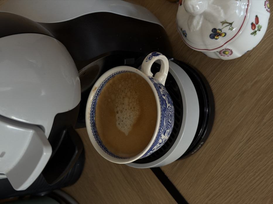 - "A white and blue patterned ceramic cup containing a light brown beverage with crema and foam is positioned on the gray and black drip tray of a Nescafé Dolce Gusto by Krups capsule coffee machine" by FM-GuW672, licensed under CC BY 4.0
