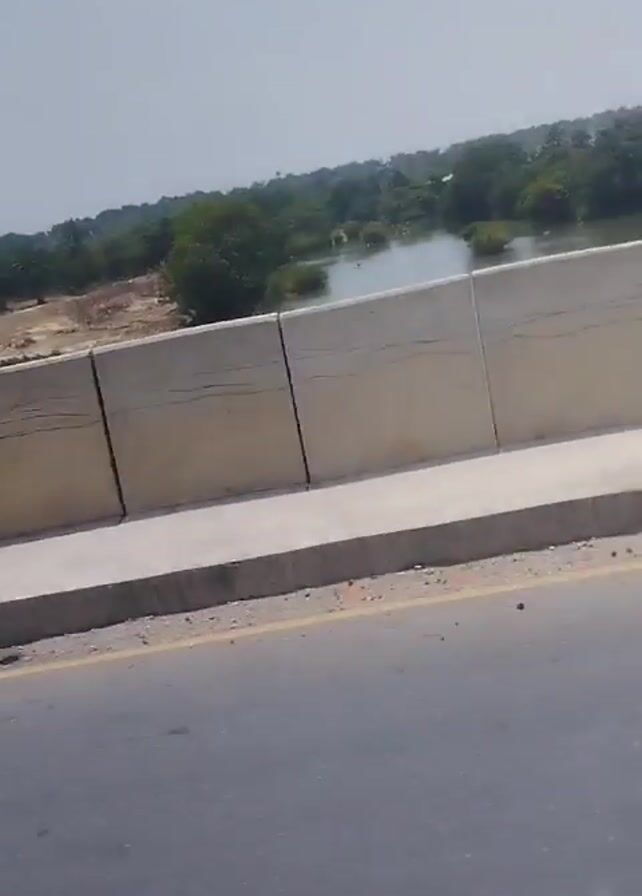 view from a moving vehicle, presumably a car, driving on a bridge. The camera is positioned at an angle, looking over the bridge's concrete barrier. A body of water, possibly a river or lake, is visible behind the barrier, surrounded by trees and vegetation. On the other side of the water is a landscape of light brown dirt. The sky is light blue with some scattered clouds. The road appears asphalt, with a yellow line. The sound of wind is prominent.