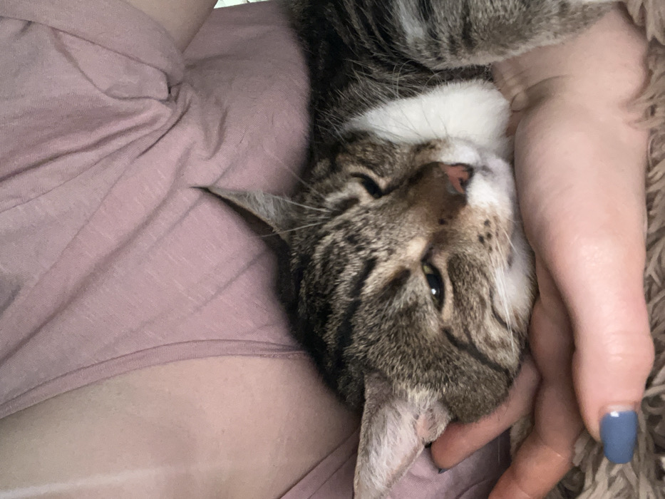 A brown and grey tabby cat with white markings on its chest and face is nestled in a person's hand. The cat's head is tilted upside down, its eyes partially closed. The person has light skin and a blue-grey nail polish. The cat rests against the person's chest, covered in a light pink shirt. A fluffy, light brown blanket is visible in the background.