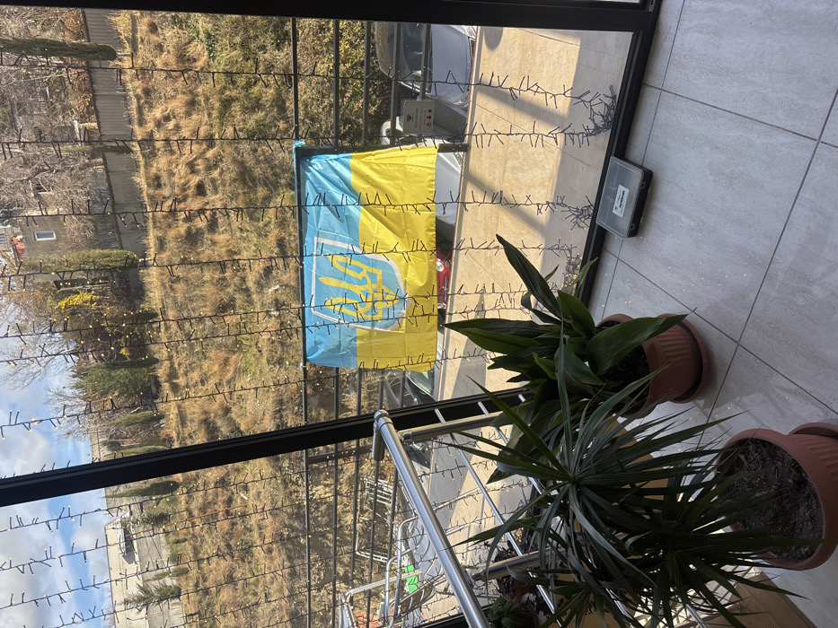 A Ukrainian flag is displayed outside a window decorated with thin Christmas lights