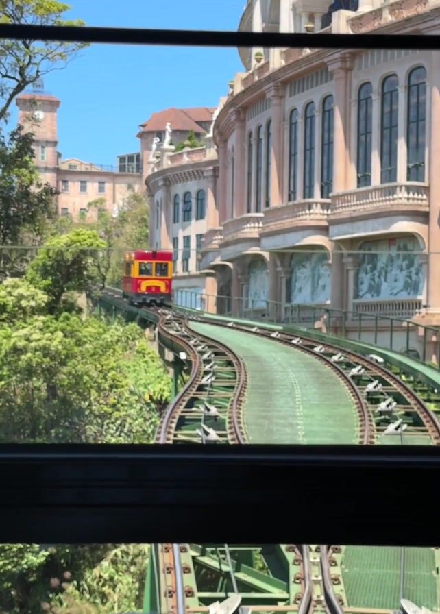 red and yellow funicular train on a track approaching the viewer. The train is labeled “Land of Snow 2”. The track is green and winds around a building with tall, arched windows. Trees are visible along the track. The sky is blue and clear. The shot is taken from within another funicular car.