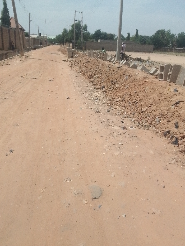 The image displays an unpaved reddish-brown dirt road, situated in the city of Muhammadu Dikko Stadium, Nigeria, under clear daylight conditions