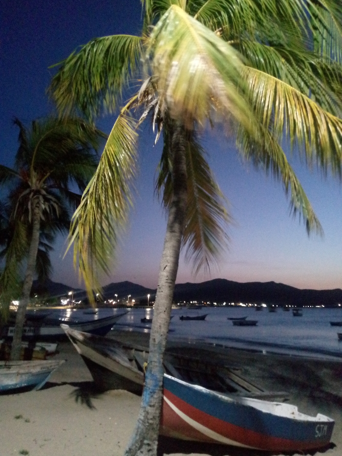 A beach scene at dusk featuring multiple palm trees. Several boats are beached on the sandy shore, some partially in the water. Lights from a distant city or town illuminate the dark coastline. A mountain range is visible in the background, under a twilight sky transitioning from dark blue to light blue near the horizon.