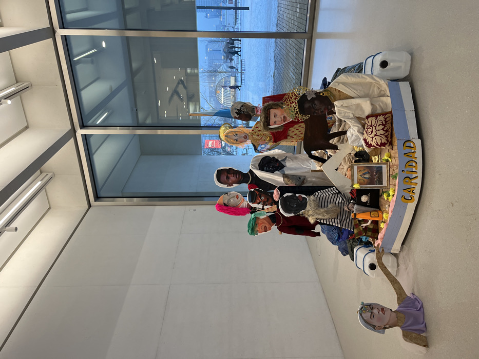 An art installation, "Caridad" by Goshka Macuga, is positioned on a light-colored floor within a modern, minimalist gallery space at the Museum of Modern Art in Warsaw, Poland. The installation features a stylized boat-like structure, painted light blue and white with the word "CARIDAD" in yellow on its side, appearing overloaded with approximately 13-14 diverse mannequin-like figures and busts. The figures vary in skin tone, headwear (e.g., pink spiked hair, blonde updo, green turban, blue headwrap), and attire, displaying a range of styles from realistic to highly stylized and masked. Notable figures include a dark-skinned male mannequin in a white sleeveless top, a figure with a highly made-up blonde face, and a figure with an all-black face and furry collar. Objects within the boat include a framed image of the Virgin Mary, a "CHANEL" bag, an orange bottle, yellow decorative elements, and a red patterned cushion. Two white plastic jerry cans are attached to the boat's exterior. In the foreground, a female bust with light skin, a purple top, and a blue headwrap, resembling Frida Kahlo, emerges from the floor with her left arm extended towards the boat. The gallery space has white walls, grey ceiling beams, and linear fluorescent lighting. Large, floor-to-ceiling windows on the right reveal an exterior view of a snow-covered urban landscape. Distant buildings, bare trees, and a few indistinct human figures are visible. A partial red commercial sign and a blue and white flag on a pole are also discernible in the snowy outdoor scene.