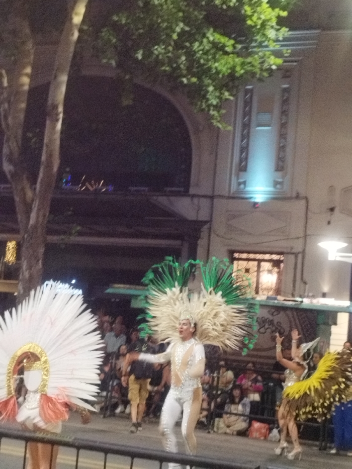 A street celebration unfolds at night, featuring three dancers in elaborate costumes. On the left, a figure sports a white and orange feathered headdress. The central dancer wears a white sequined bodysuit and a large headdress adorned with cream and green feathers. To the right, a dancer has wings with gold and yellow feathers. A crowd watches from behind a barrier, with a building backdrop.