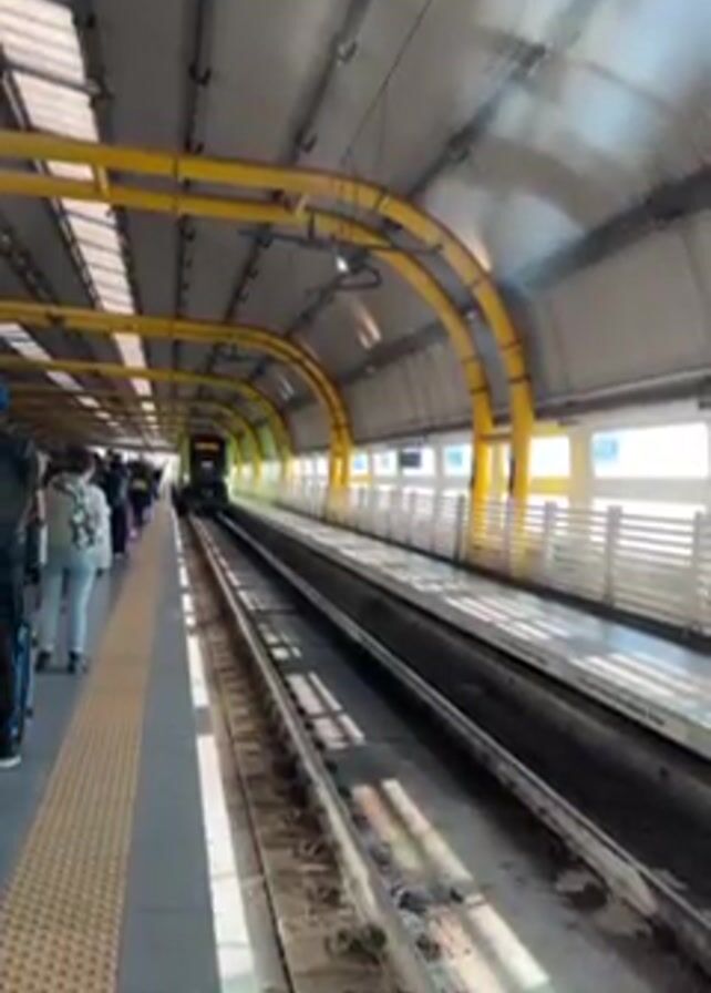 n elevated train station with a train approaching. A crowd of people is waiting on the platform, some with luggage. The station has a high ceiling with yellow arched supports and numerous rectangular windows on the far side. The train is green and white, moving along a track towards the camera. The platform is marked with a yellow safety line.