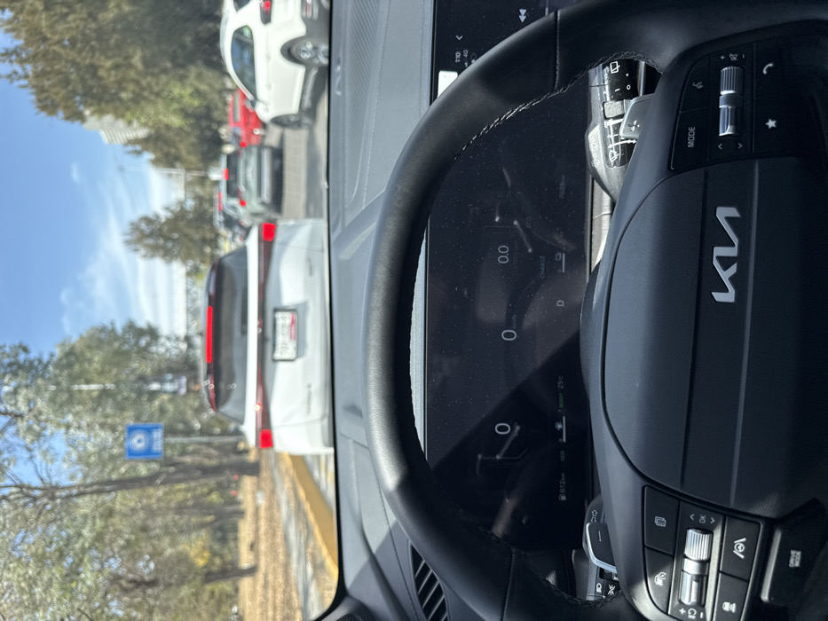 The interior of a Kia vehicle is shown, with the steering wheel prominently displaying the Kia logo