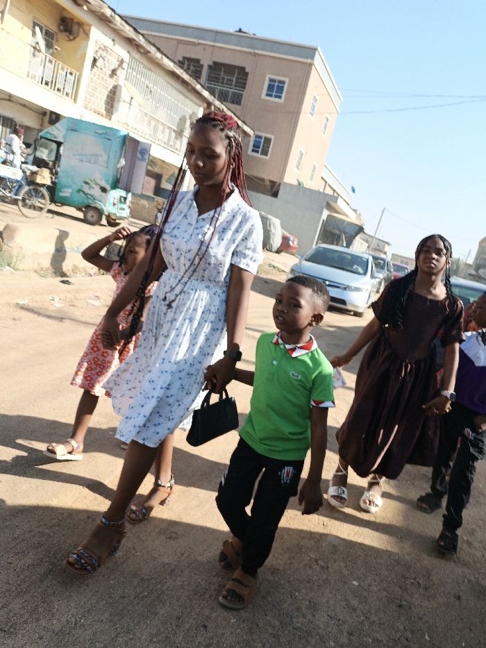 Five individuals, consisting of one female adult/older teenager and four children, walk on an unpaved street in Sabon Gari West, Nigeria