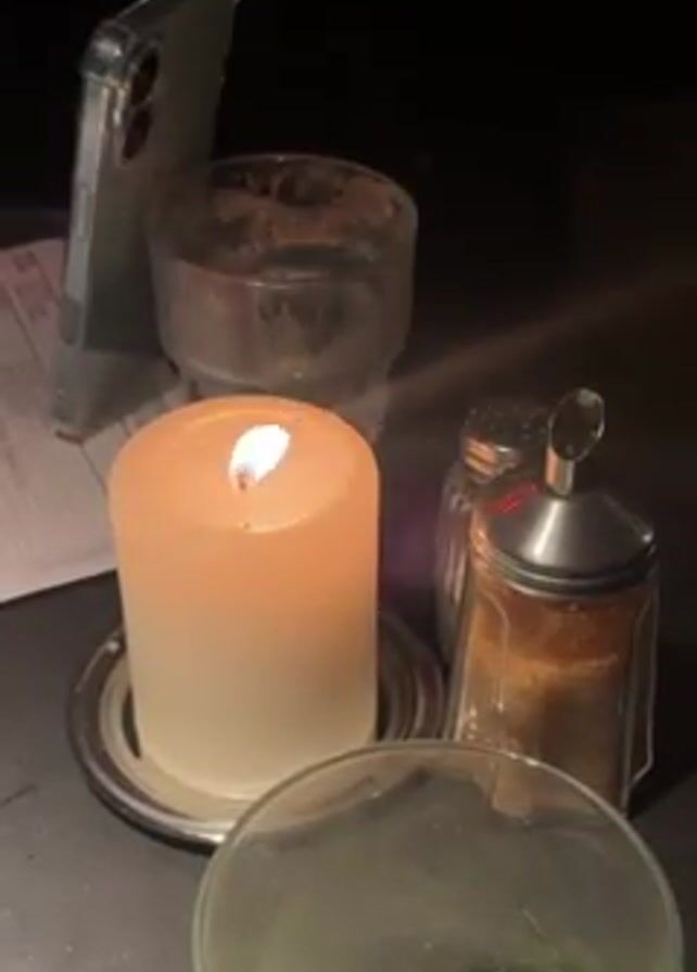 dimly lit table setting with a lit candle as the primary light source. A smartphone in a clear case leans against a dirty glass. Beside the glass are a salt shaker and a sugar dispenser. Another empty glass is in the foreground. The surface appears to be a dark, possibly stone, table. A white bill or receipt is partially visible behind the phone.