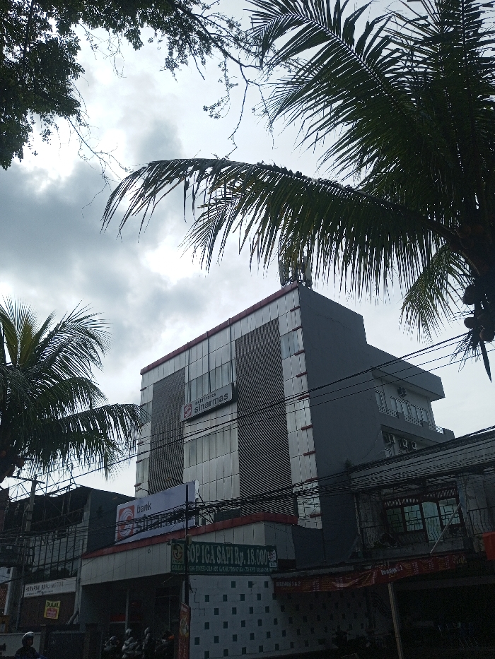 A multi-story building with "sinarmas" sign dominates the scene, partially obscured by palm trees